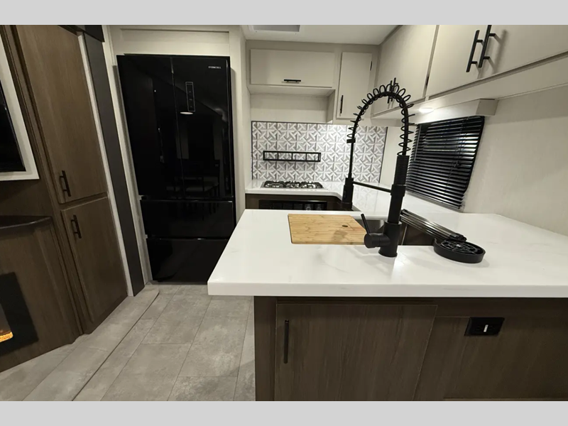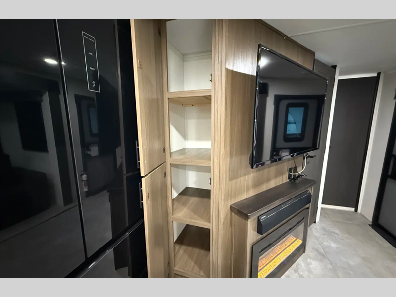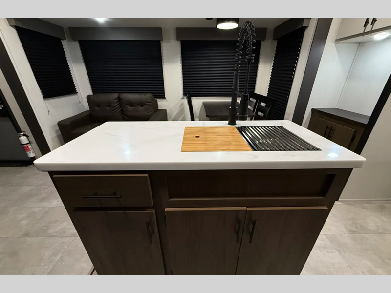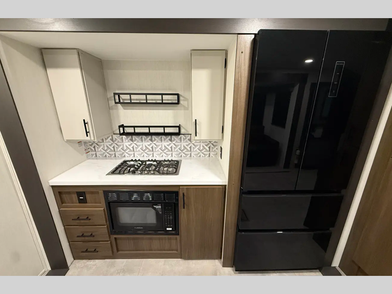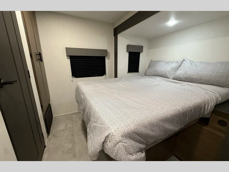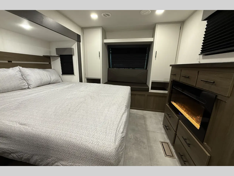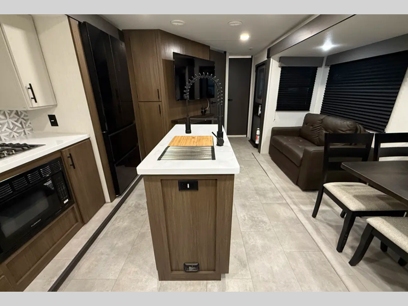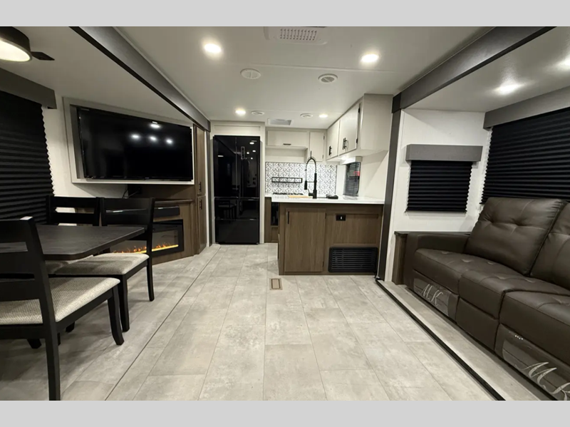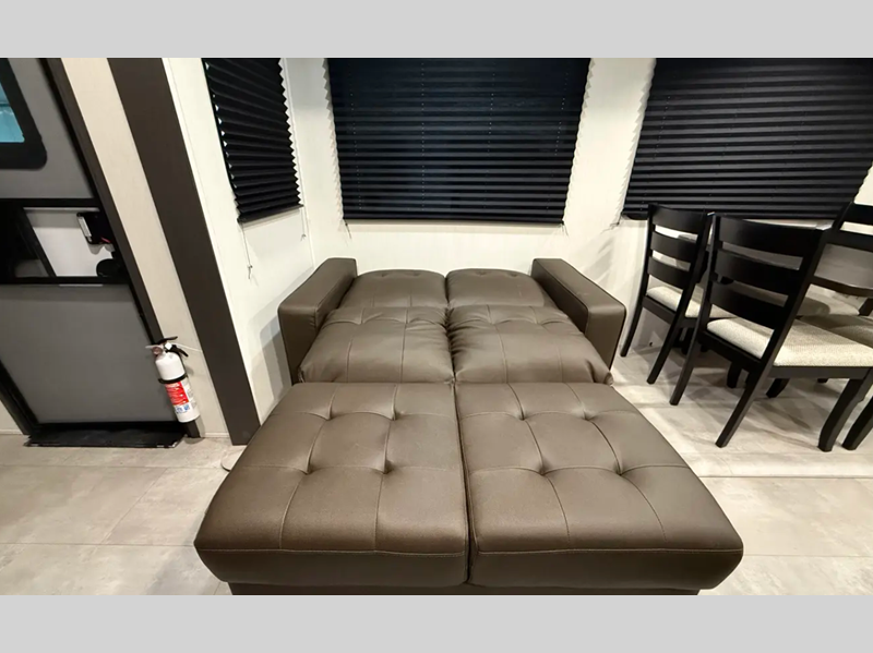 The exterior comes outfitted with welded aluminum framing, power awnings with LED lights, a fully enclosed underbelly, high density foam block insulation, Tufflex PVC Roof, and a tankless water heater. There are quite a few appliances that you'll find yourself using just about every day, like the Smart TVs, the soundbar, and 30" microwave oven for all of your cooking needs, plus two 15,000 BTU air conditioners so your inside temperature can keep your comfortable both day and night.